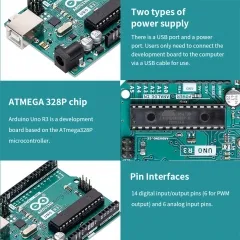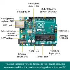 Arduino Uno is a microcontroller board based on the ATmega328P (datasheet). It has 14 digital input/output pins (of which 6 can be used as PWM outputs), 6 analog inputs, a 16 MHz ceramic resonator (CSTCE16M0V53-R0), a USB connection, a power jack, an ICSP header and a reset button. It contains everything needed to support the microcontroller; simply connect it to a computer with a USB cable or power it with a AC-to-DC adapter or battery to get started.. You can tinker with your Uno without worrying too much about doing something wrong, worst case scenario you can replace the chip for a few dollars and start over again.