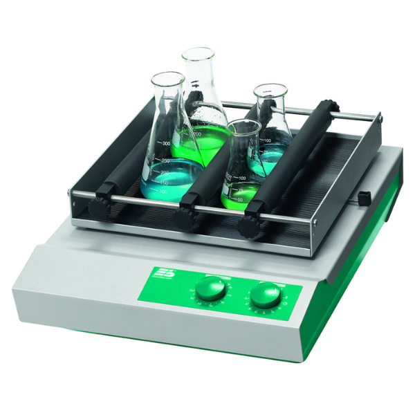 Includes flask attachment system with 3 clamping rollers. Versatile, for use in medical diagnostics, haemotology, for cell cultivation or analysis. Max. load 4 x 500 ml or 2 x 1000 ml Erlenmeyer flasks.