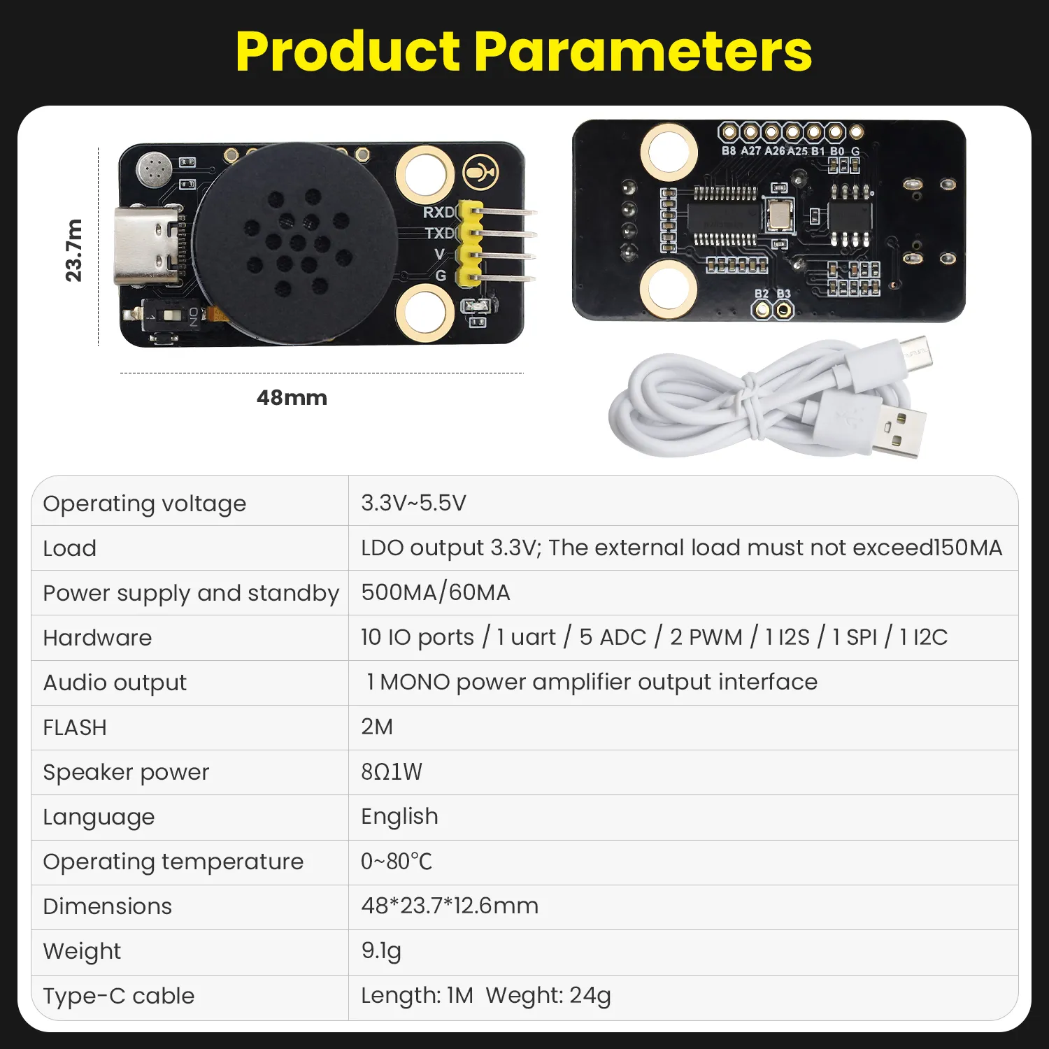Great product for STEM learning! The Keyestudio SU03 XiaoZhi English Voice Module works perfectly with Arduino and is very easy to set up using the Type-C connection. The voice recognition is clear and responsive, making it ideal for DIY electronics projects. Highly recommended for students, beginners, and anyone interested in smart voice-controlled applications.