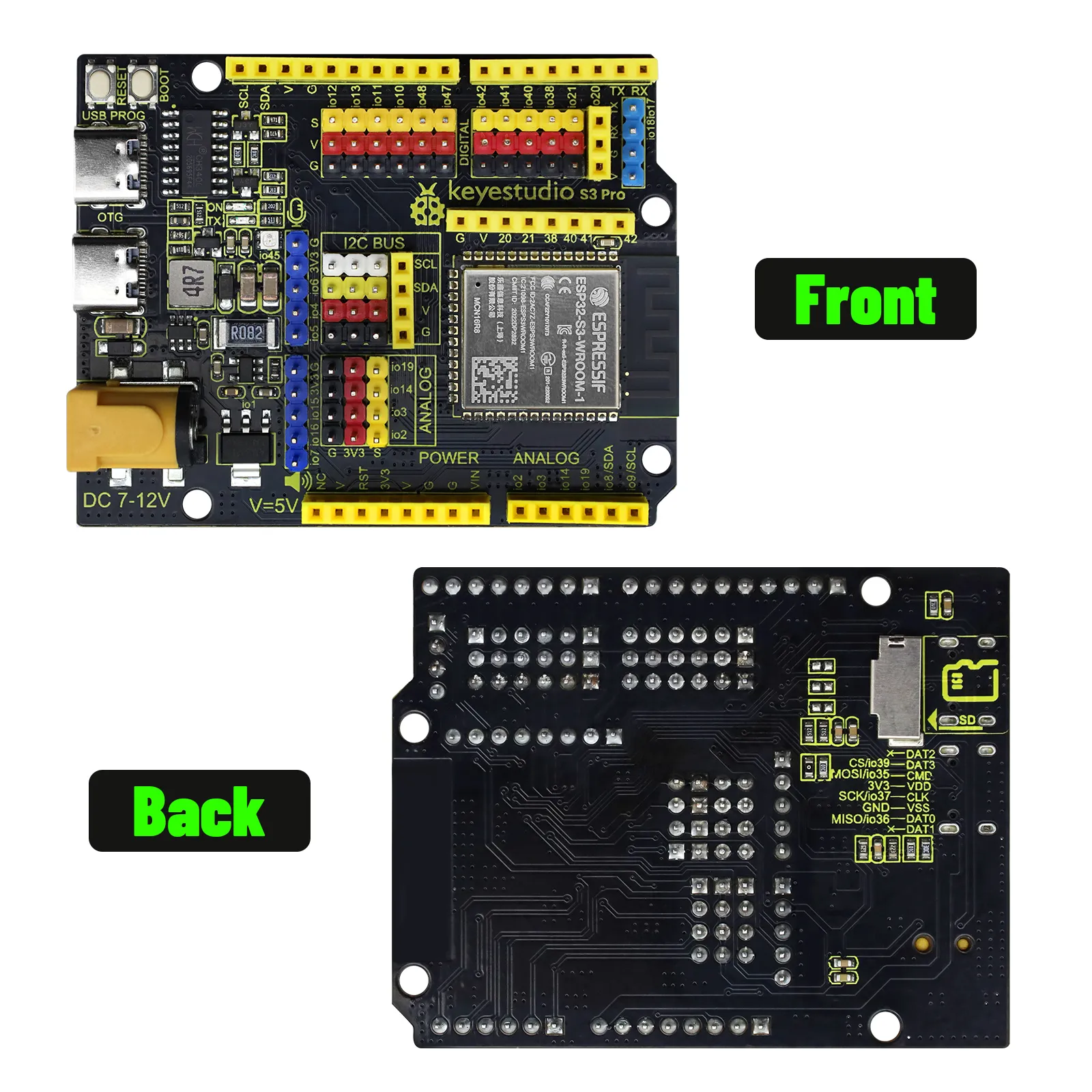 The ESP32S3 PRO development board is based on the ESP32-S3-N16R8 module. Compared to standard boards, it features current sensing and SD card support, with most pins routed through pin headers. Its on-board DC-DC and LDO chips provide sufficient power for most common modules, enabling developers to extend functionality.