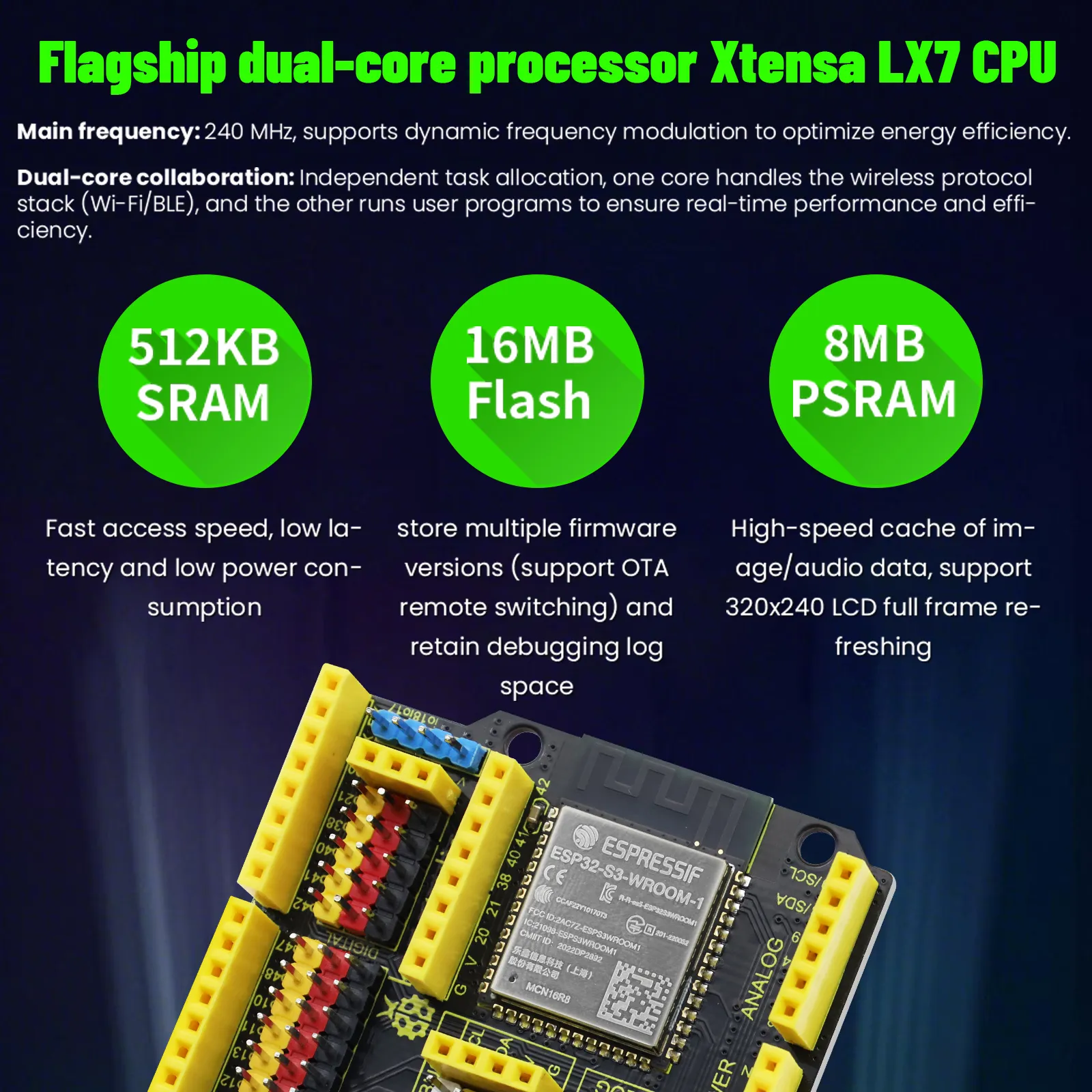 The board is designed with generous onboard memory, offering ample flash storage and RAM to support complex code execution, large data handling, and smooth operation of advanced features such as voice recognition, image processing, and real-time data transmission. Its optimized architecture enhances energy efficiency while maintaining consistent performance, making it suitable for both prototyping and long-term deployment in energy-conscious environments.