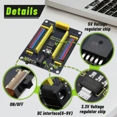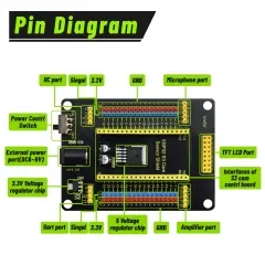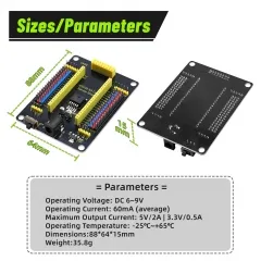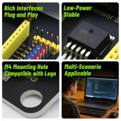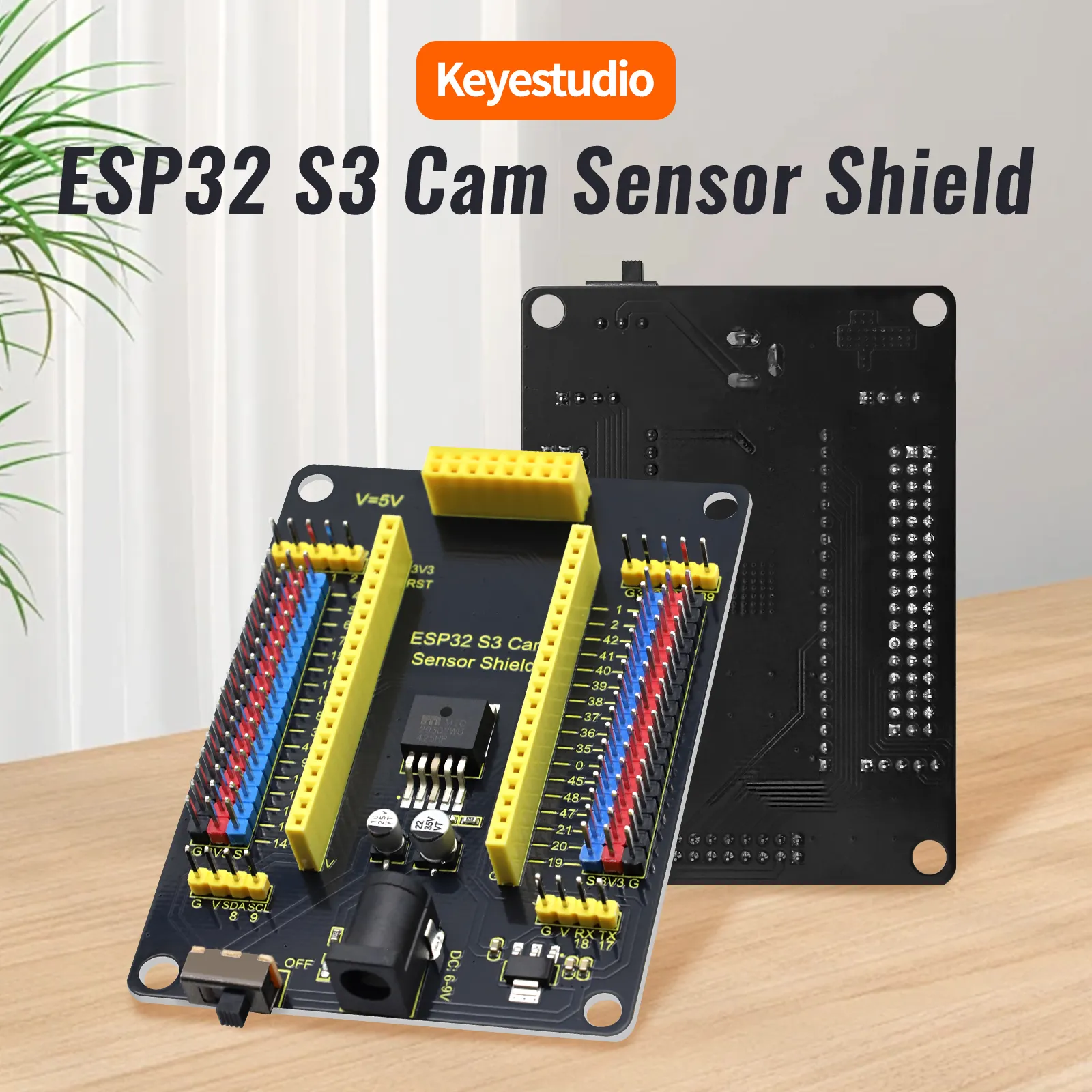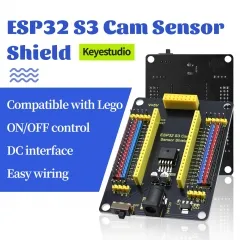 Keyestudio ESP32 S3 Cam Sensor Shield is an expansion board developed based on the S3 cam. It extends the pins of the S3 cam development board through a 2.54mm pin interface and includes interfaces for IIC, serial port, and a 1.54-inch color screen. The expansion board can be powered by a DC interface to supply a DC voltage of 6-9V. Additionally, a toggle switch is reserved for convenient control of power on/off. In terms of structure, it is equipped with four M4 positioning holes and is compatible with the size of Lego parts.