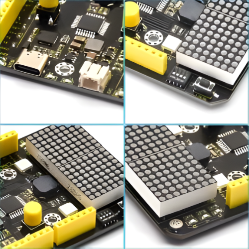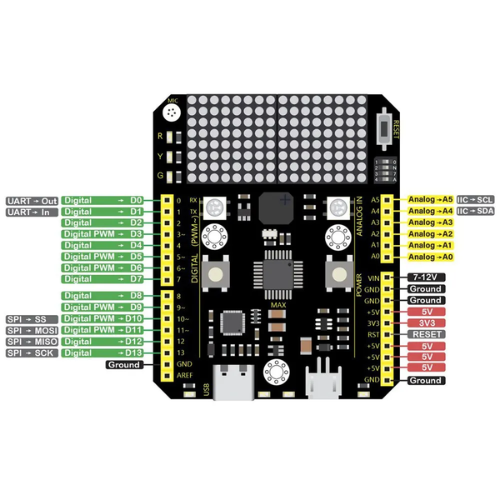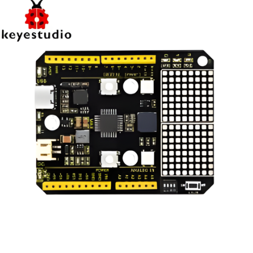 Keyestudio Max development board is an Arduino uno-compatible board, which isbased on ATmega328P MCU, and with a cp2102 Chip as a UART-to-USB converter.MAX development board integrates three LEDs, two 6812RGB LEDs, two button switches, a buzzer, a microphone sensor, a light sensor, and an 8*16 dot matrix.