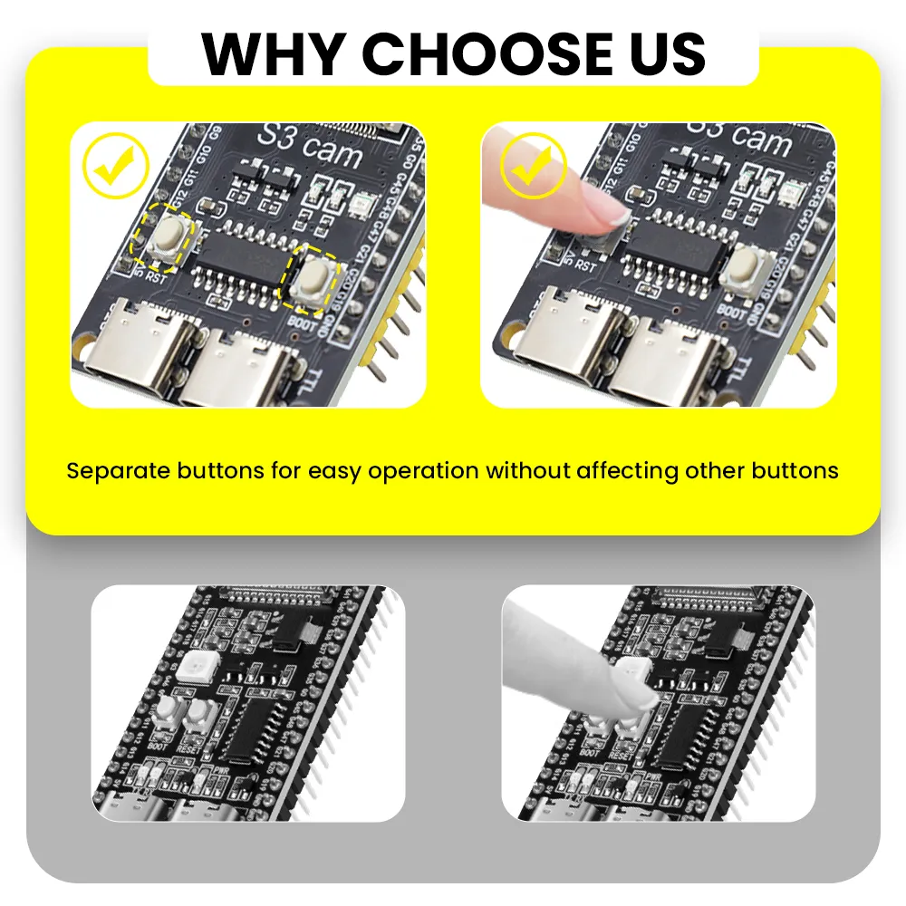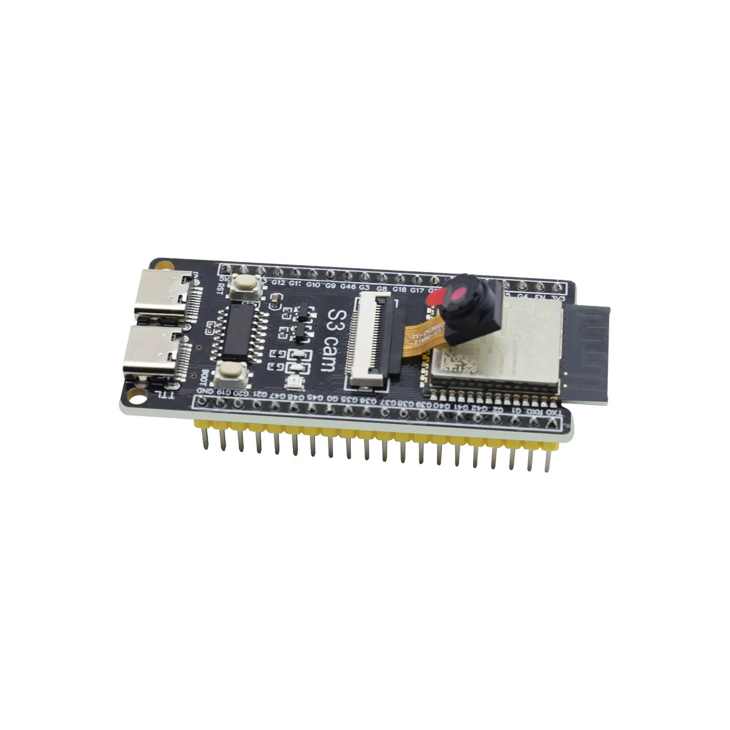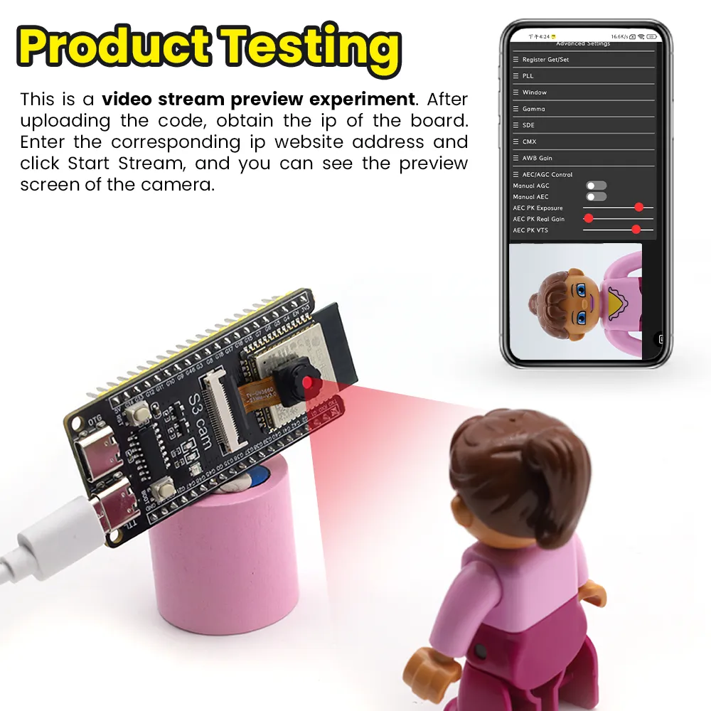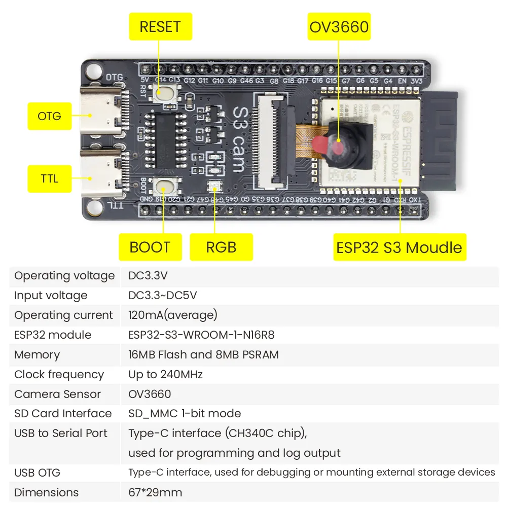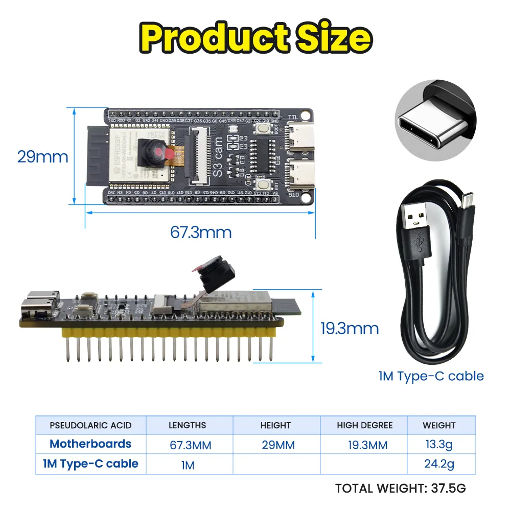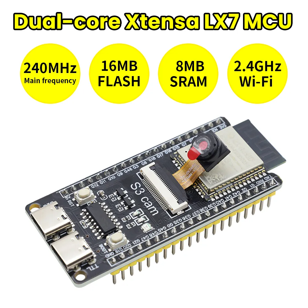 The S3 mini development board is based on the Espressif ESP32 S3 WROOM-1-N16R8 module. It comes with a dual-core Xtensa LX7 MCU whose main frequency is up to 240MHz, and it integrates storage(16MB FLASH and 8MB SRAM), 2.4GHz Wi-Fi and low-power Bluetooth(Bluetooth® LE). It is also rich on interfaces, including Type-C to serial port, Type-C to OTG, RGB LED, and GPIO pin headers with a spacing of 25.5mm, which is convenient to quickly develop and experiment. Therefore, it is widely applied to smart home, industrial automation, healthcare, consumer electronics, smart farm, etc.
