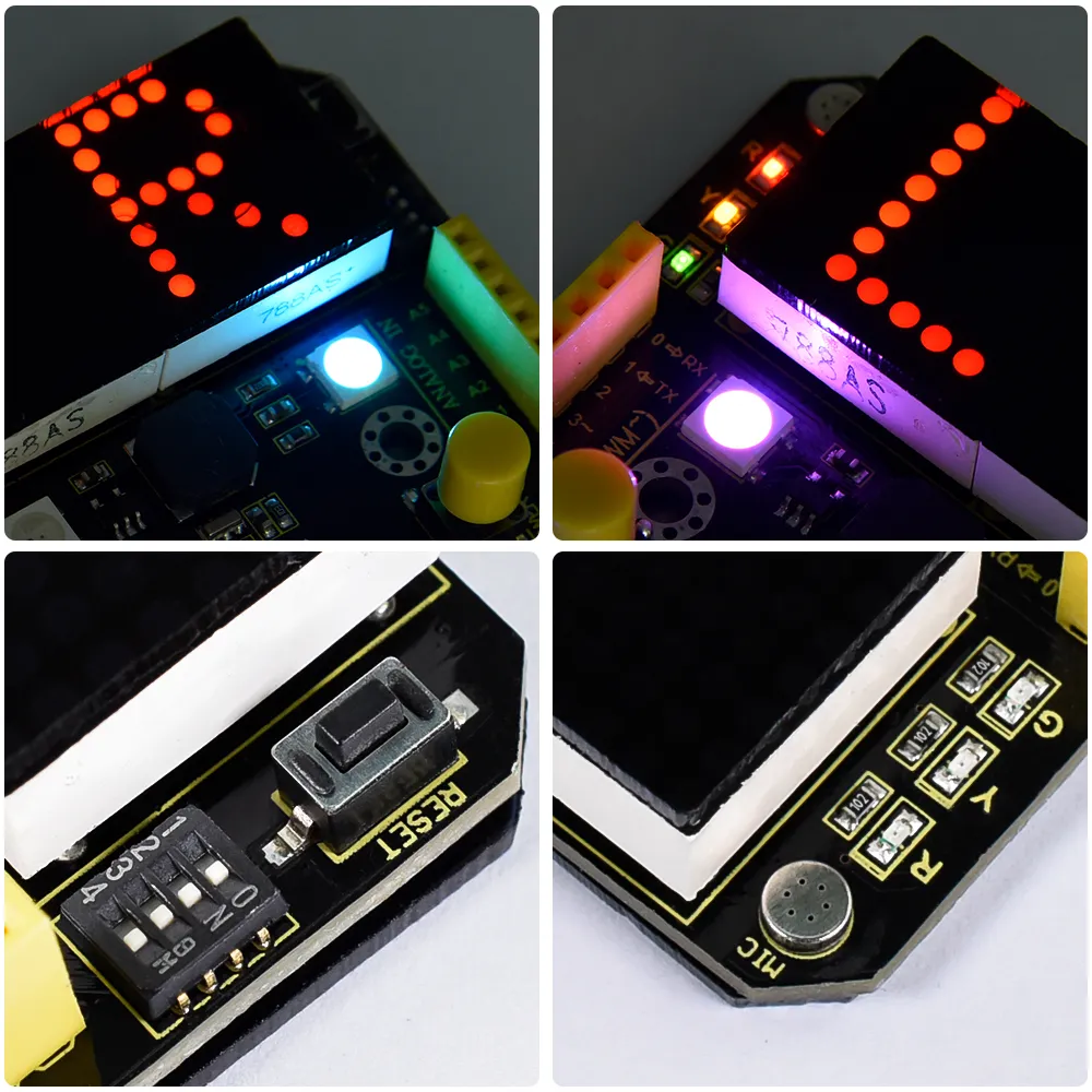 The UNO MAX main control board uses a Atmega328p main control chip, and integrates a CP2102 USB to serial port module, a RT6212AHGJ6F DC-DC power module, a RT9167A-33GB DC-DC power module, two separate buttons, two 6812 RGB lights, a microphone, an 8×16 dot matrix, a buzzer, a photosensitive sensor, a red LED, a green LED, and a blue LED.