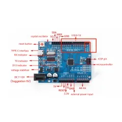 The processor core of the UNO R3 BOARD is ATMEGA328P-AU, which is fully compatible with ARDUINO UNO REV3. It comes with 14 digital input/output pins (six of which can be used as PWM output), 6 analog inputs, a 16MHz crystal oscillator, a USB port, a power interface, an ICSP interface, and a reset button.