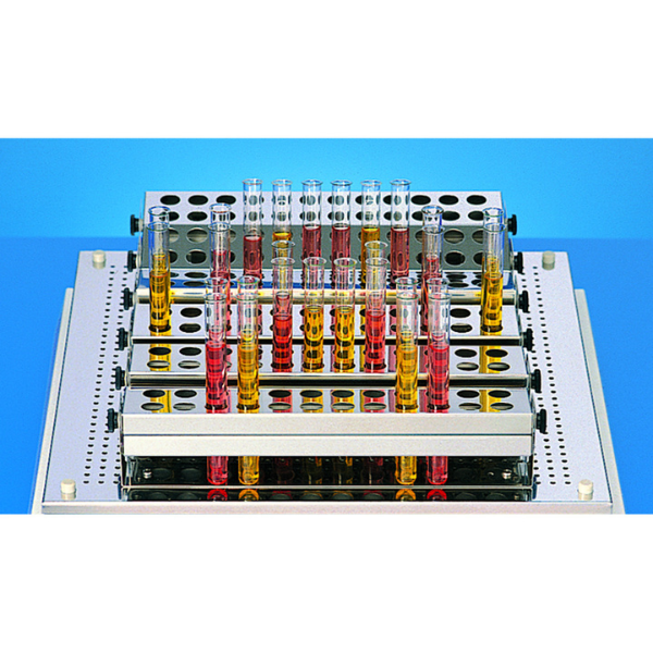 Stainless steel, for max. 24 test tubes, 12mm to 17mm diameter, perforated section can be tilted by 90°, with clamping springs for secure grip and silent shaking of tubes. For screwing onto shaking trays 3950, 3966 and 3980.